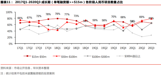 从项目币种分布来看,在初创期阶段,人民币项目处于市场绝对主导地位,在整体交易量中的占比稳定在九成以上。而成长期阶段人民币项目占比则稳定在六成左右,其中,单笔融资额在3亿美元以下的各阶段人民币项目占比主要在50%-70%之间波动,而单笔融资在3亿美元及以上的人民币项目占比则主要在20%-40%之间波动,存在显著差异。