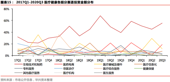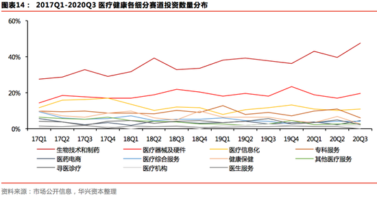 今年Q3,医疗健康领域热度依旧,该行业的投资数量和投资金额占比分别为18.5%、18.5%,均处于市场第一位。其中,生物技术和制药依旧是当前最为火热的细分赛道,且热度在不断提升,其为医疗领域贡献的交易量和交易金额比例已经分别由2017年Q1的27%、32%提升至2020年Q3的47%、56%。医疗器械受到的关注程度也较高,在今年第三季度为医疗行业带来了20%的交易量。此外,受京东健康8.3亿美元大额融资事件影响,医药电商领域投资金额大幅上升,占整体比例为19%。