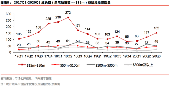 伴随国内疫情的有效控制,国内经济活动恢复正常,中国私募股权市场投融资压力进一步释放,驱动2020年Q3各阶段交易数量继续增加。已公开披露融资金额的案例中,初创期(单笔融资额<$15m)阶段交易热度有所回升,投资数量为678起,相较于2020年Q2环比增加16%,同比降幅也收窄至3%。与此同时,成长期(单笔融资额>=$15m)阶段的交易热度也在明显提升,2020年Q3发生的投资事件数量为274起,环比增加18%,同比增加19%;值得关注的是,2018年Q4开始,成长期阶段投资事件数量同比变化持续为负,今年第二季度首次转正,第三季度则继续保持了正向的变化。