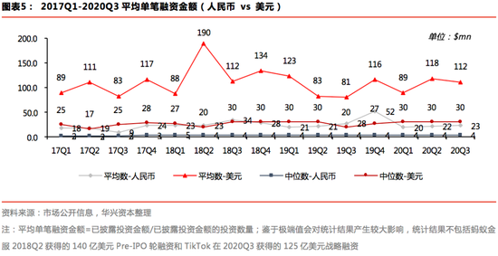 此外,市场结构也保持稳定状态。从交易币种来看,2019年之前,美元市场整体趋向走强,投资数量占比由2017年Q1的7%快速提升至2018年Q4的16%,市场份额增加了一倍以上。此后,伴随市场整体遇冷,美元基金的投资活跃度开始同步降低,美元市场的投资数量占比保持在16%-17%的稳定水平。同时,市场的投资阶段也没有太明显的变化,虽然人民币和美元市场的平均单笔投资金额在各季度均有幅度不等的波动,但投资金额的中位数变化则较小,分别稳定在400万美元和3,000万美元左右的水平。值得关注的是,受威马汽车、猿辅导、京东健康等大额融资事件的影响,项目投资金额的平均值通常会远大于其中位数,且容易产生波动。