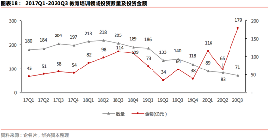 教育培训领域,行业加速分化,资源向头部集中的趋势越发明显。2017-2018年,教育培训是市场上的热门赛道,该领域内的投资数量及投资金额双双提升;2018年Q4,在资本市场遇冷的背景下,国家政策频出,市场竞争日趋激烈,在线教育投放成本快速攀升,教育板块也开始降温,带动行业竞争格局分化;今年,在疫情的影响下,线上教育业绩暴增,加上行业格局日渐明朗,头部项目纷纷获得资本大额资金加持,尽管教育领域投资数量仍保持下降趋势,但整体投资金额大幅上升。企名片数据显示,今年Q1-Q3,教育板块发生的投资事件数量为243起,同比下降47%,而投资金额达到了360亿元,同比提升111%。