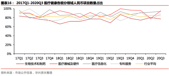 从相对变化来看,近两年来,市场对医疗健康、企业服务、科技(先进制造、硬件)、食品饮料四大行业的青睐程度持续上升,而对于金融、区块链、旅游户外、社交社区、体育健身等领域的偏好程度持续下降。