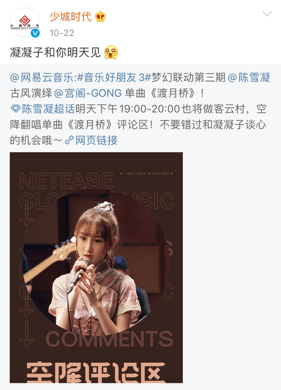 在这场合约竞争中,最终拿下陈雪凝经纪约的音乐公司“不要音乐”,签约7天后便收到了陈雪凝发来的通知函——单方面宣布合约无效。“不要音乐”收到解约需求通知3天后,陈雪凝与寿光坚诚签约音乐作品授权,同年12月陈雪凝又将微博简介公司更改为少城时代。