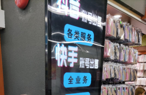 根据行业人士提供的线索,懂懂笔记来到华强北一家商城内,迎面在大厅的显眼位置就看到了“出售抖音、快手账号”的广告。根据广告上标注的联系方式,懂懂笔记联系上了一位自称“黄经理”的销售顾问。