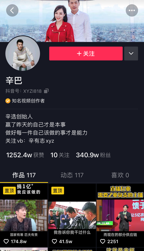 去年10月,辛巴在抖音开设账号,发布短视频,收获了340万粉丝。