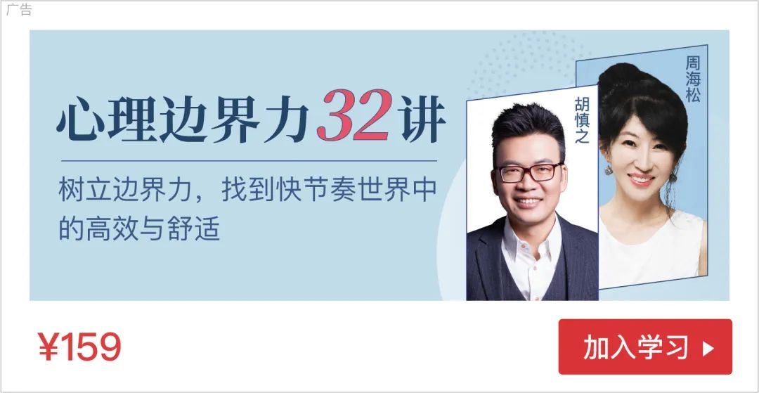 看到这里,你是不是也跟小巴一样燃起了斗志,“从明天起,做一个不拖延的人”!别等明天了,就从此时此刻开始,小巴推荐你一门能有效治疗拖延症的良课,是由胡慎之老师和周海松老师主讲的《心理边界力32讲》。