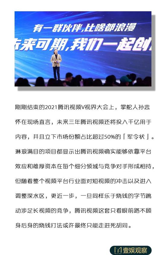 2021腾讯视频V视界大会现场图,图源:网络先不提综合视频平台这类陈旧的概念如今是否还有现实意义,因为转眼间就连B站的内容都相当综合了。想要在流媒体行业占据50%以上的市场份额或者说做到绝对领先,即便是即将迈过两亿付费用户大关的Netflix大概都不敢发出如此豪言壮语。