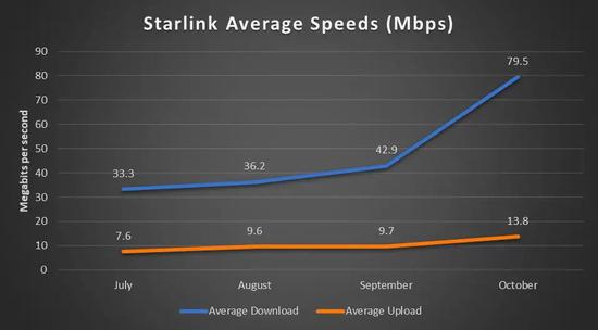 Starlink的速度大大超过了现有的卫星系统。根据数据,2020年10月,HughesNet平均下降19.84Mbps,而VIASA的Exede系统平均下降24.75Mbps。