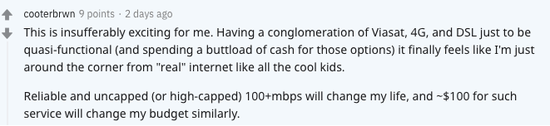 但有位用户也指出,每次中断大约是10秒至15秒,似乎每隔几分钟就会发生一次。但该用户同时指出,有几棵树挡住了信号,但还是有了相对稳定的高速连接。