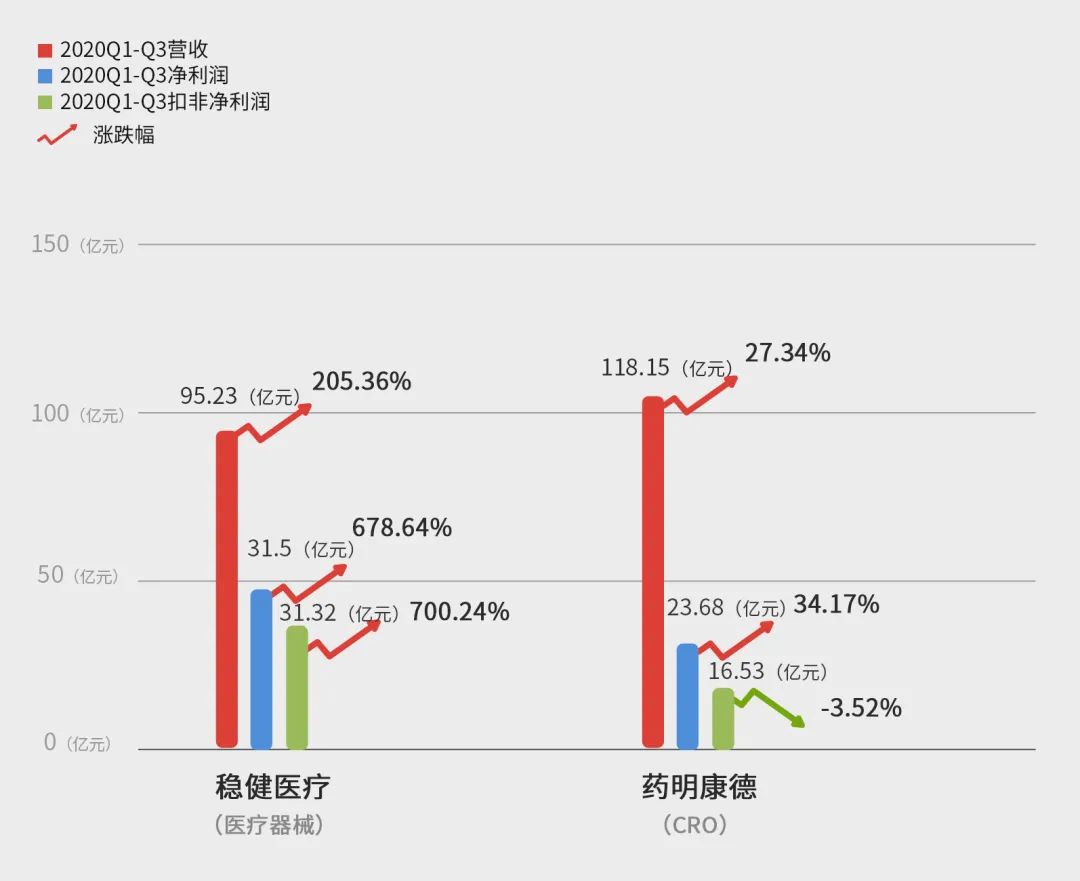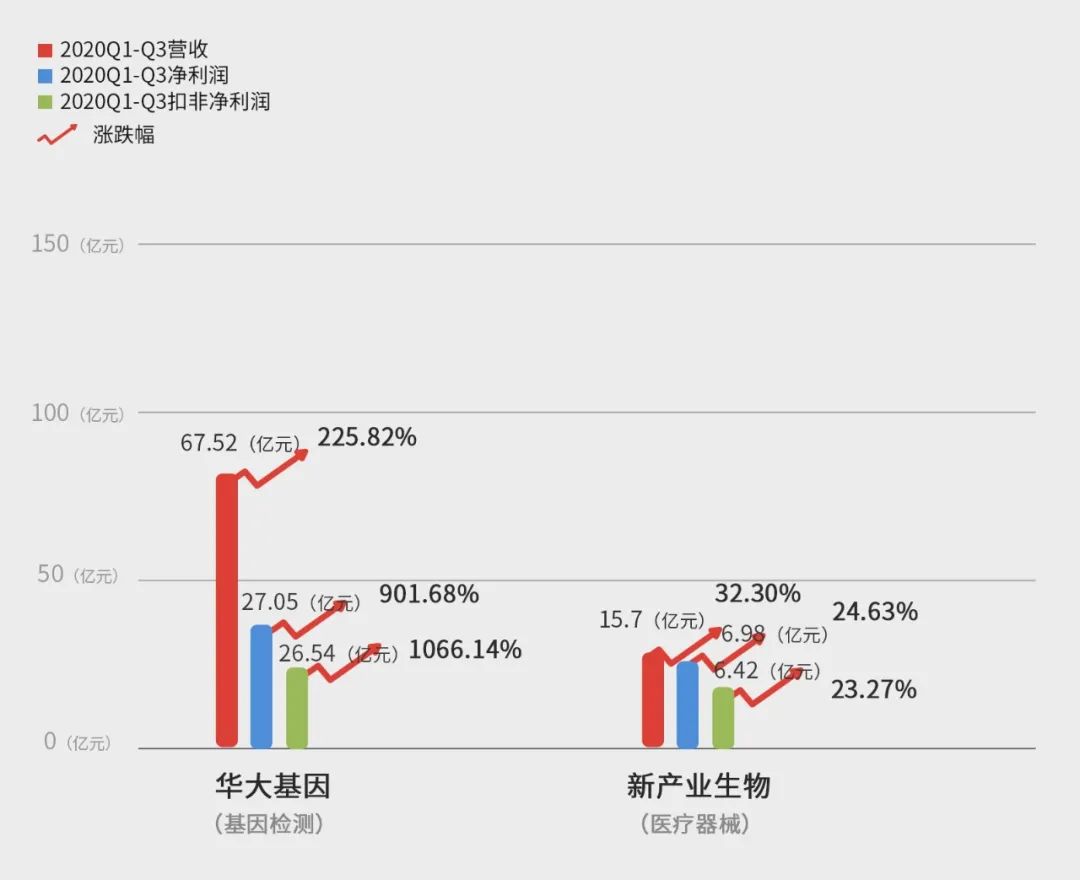 在基因检测领域,龙头企业华大基因也表现亮眼。2020年第三季度,华大基因实现营业收入26.44亿,同比增长238.761%。实现净利润10.53亿,同比增长高达1361.54%。亮眼业绩主要源自其在全球抗疫中的优异表现,例如市场对于华大基因提供的新冠病毒检测试剂盒及检测服务出现激增的需求。