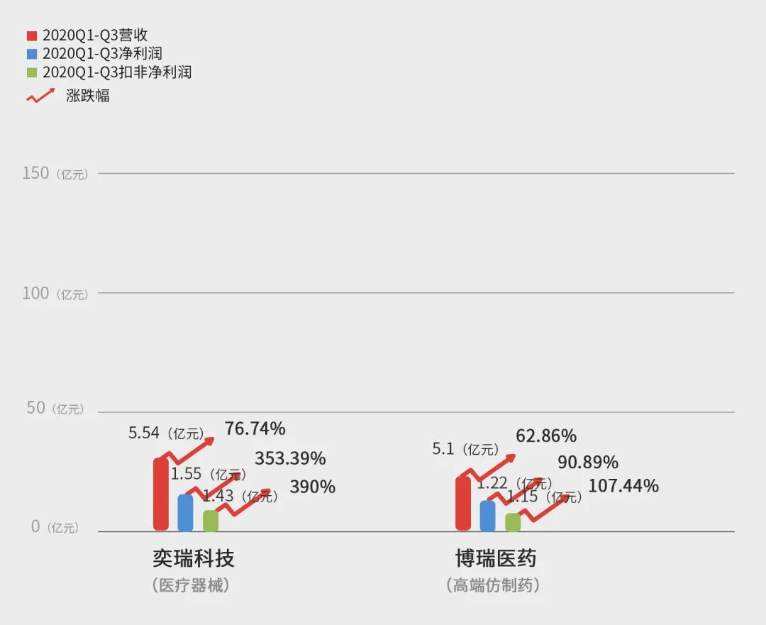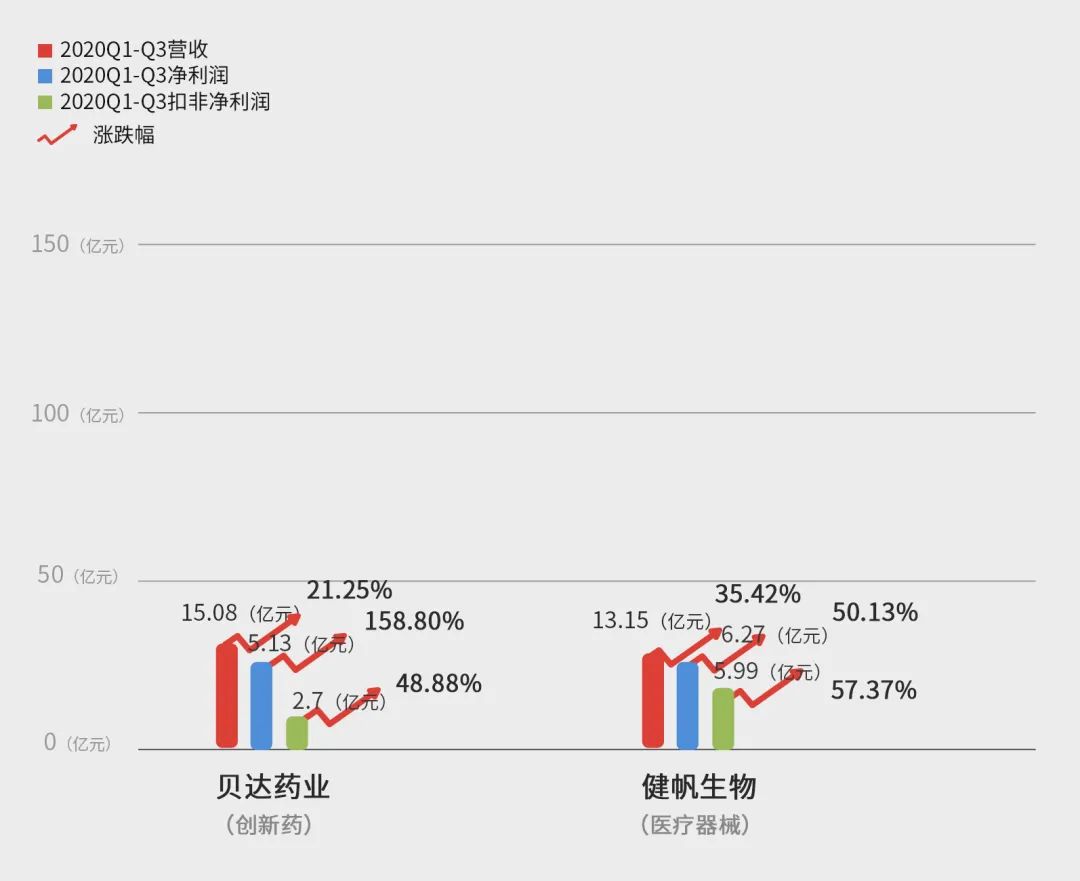创新药领域则以贝达药业为代表。2020年三季度,贝达药业营收为5.56亿元,同比增长15.45%。与此同时净利润则实现大幅增长,为3.78亿元,同比涨幅达232.74%。而在高端仿制药领域,博瑞医药2020年前三季度也实现了5.1亿元的营业收入,同比增长62.86%;净利润表现则为1.22亿元,同比增长了90.89%。