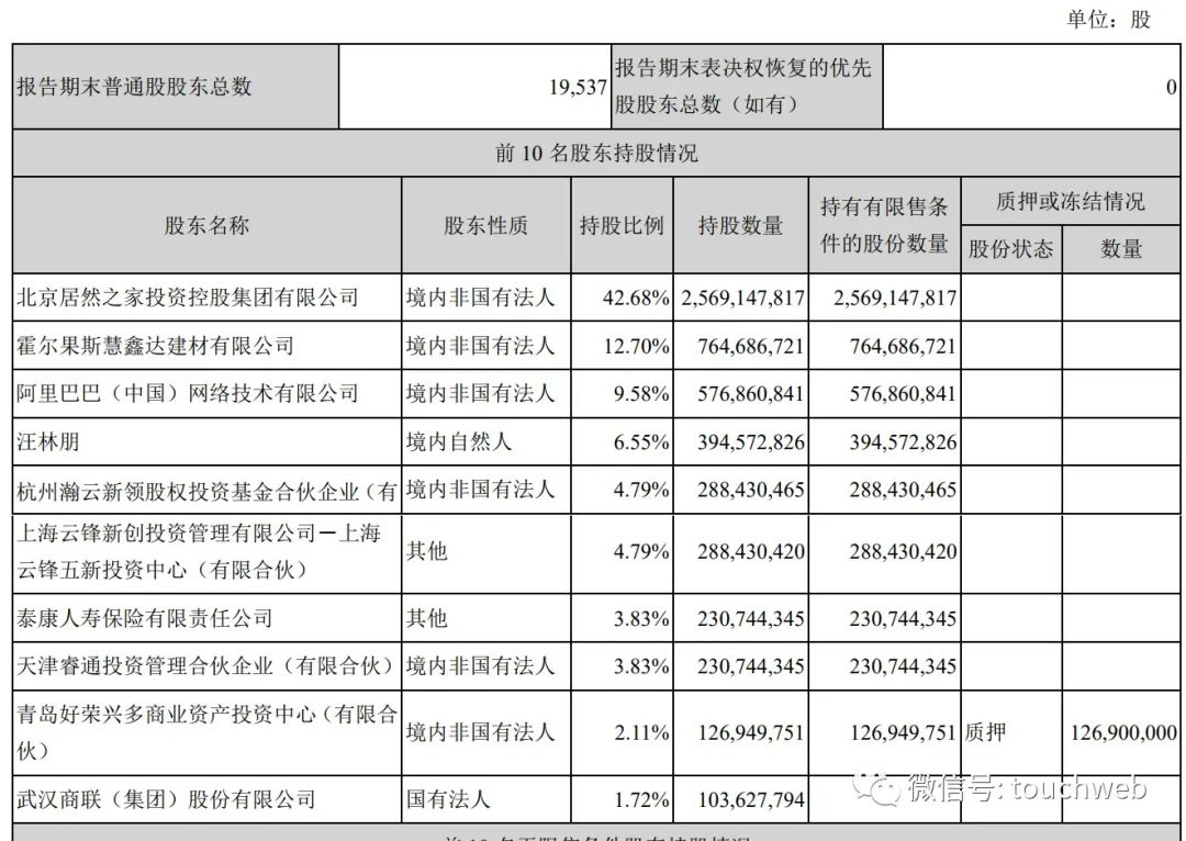 截至2020年9月30日,北京居然之家投资控股集团有限公司持股为42.68%,霍尔果斯慧鑫达建材有限公司持股为12.70%,阿里巴巴持股为9.58%;