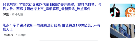 “据彭博社报道字节跳动寻求1800亿美金的估值进行一轮融资,额度是20亿美金。”紧接着36氪又发布了一条独家,“字节跳动寻求推动包括抖音、今日头条和西瓜视频在内的部分成熟业务在香港上市。”