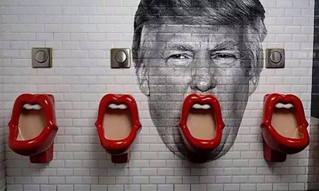 纽约的街头艺术家Hanksy最先发现“川普”(Trump)与“噗噗”(dump)押韵,因此在曼哈顿创作出了一幅把川普画成大便的街头涂鸦。或许这是川普和厕所缘分的开始吧。