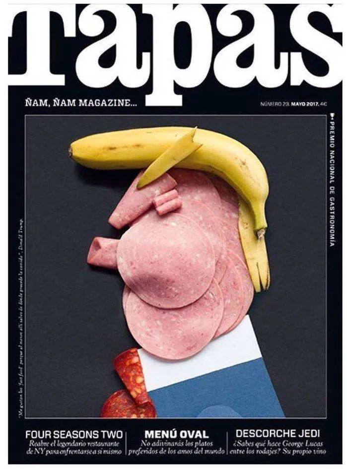 美食杂志如何使用川普的IP,《Tapas》为大家做了一个范例,火腿、萨拉米、香蕉皮……突出其特色的眉型和嘴,川普的美食封面就这样诞生了。