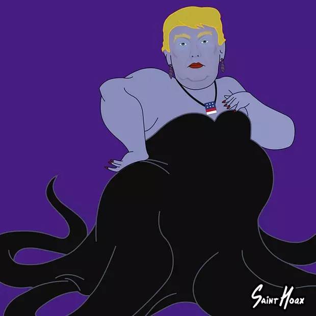 更有变装皇后川普、海巫婆川普和矮人川普,这是叙利亚艺术家Saint Hoax用来表达对川普关于叙利亚难民言论的不满之作。