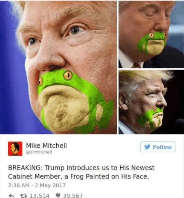 美国德州的艺术家Mike Mitchell恶搞的川普,让一只青蛙长在川普的嘴上,青蛙形象竟然如此活灵活现。