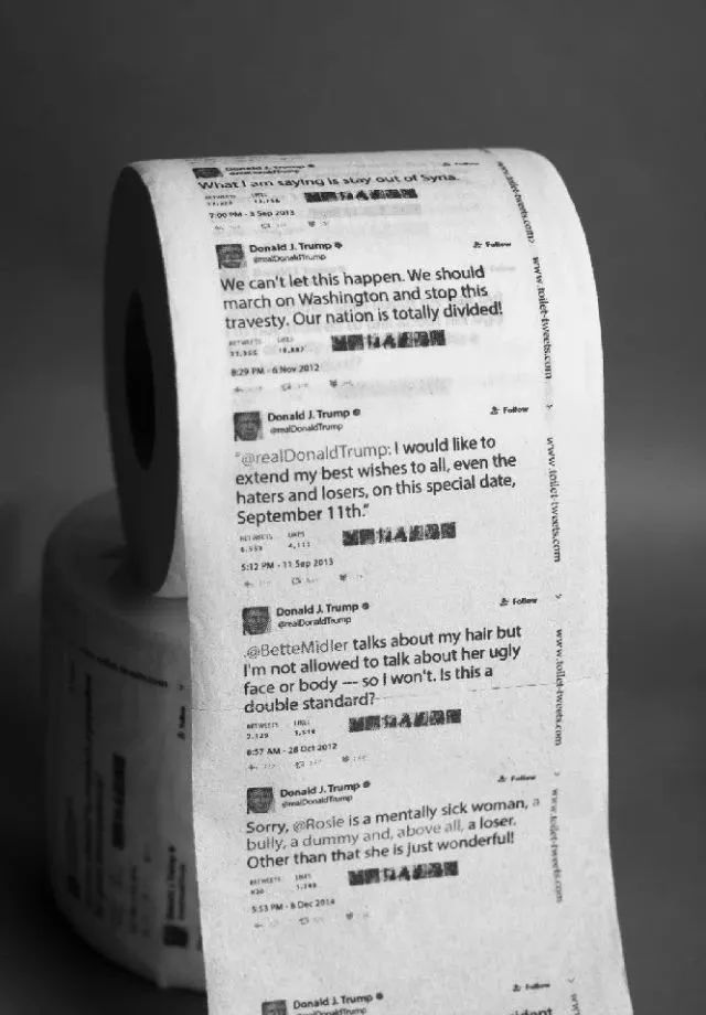 对于川普在推特上的“疯言疯语”,亚马逊全部印在了卫生卷纸并售卖。这个感觉和印着川普的脸的卫生纸可以配套使用。