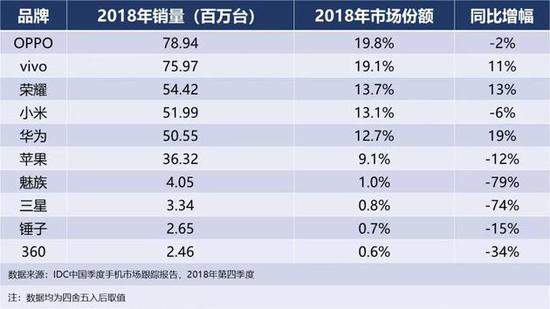 据IDC数据,2018年第四季度,荣耀的销售量和市场份额都已超越小米。