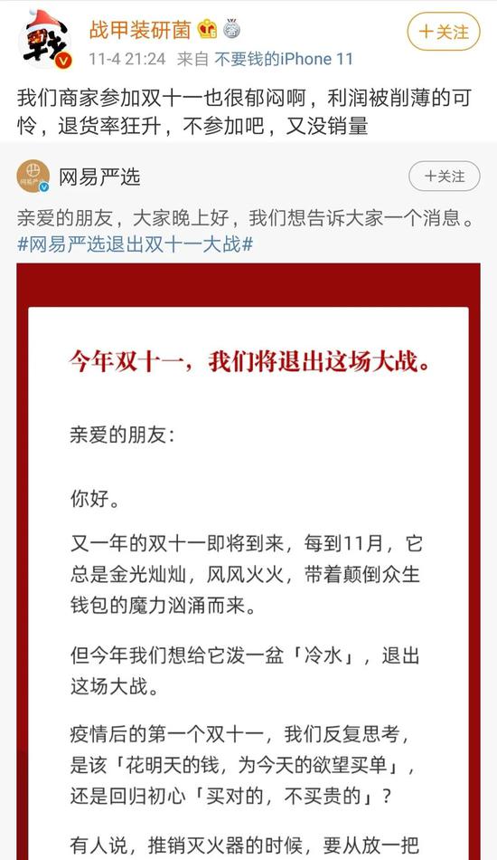 尽管有人抱怨,“双十一是大商家的狂欢,小商家的落寞。”但也有一些大商家叫苦不迭,大量的囤货和前期铺设得高昂宣传费,都是肩上的沉重负担。微博上粉丝数778万的博主“战甲装研菌”直言,“我们也很郁闷,利润可怜、退货率狂升,但不参加又没销量。”