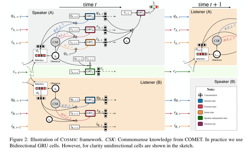 目前最先进的方法在上下文传播、情感转移检测和区分相关情感类别方面经常遇到困难。通过学习不同的常识表示,COSMIC解决了这些挑战,并在四个不同的基准对话数据集上取得了新的情感识别最先进的结果。