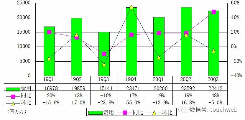 京东第三季度费用为224亿元,较上年同期的151.41亿元增长48%。
