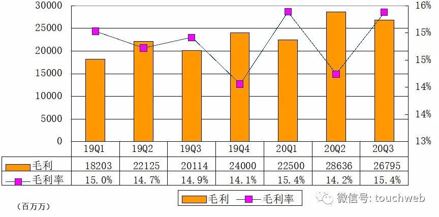 京东第三季度毛利为267.95亿,毛利率为15.4%,上年同期的毛利率为14.9%。