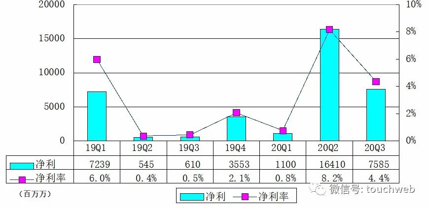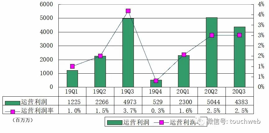 京东2020年第三季度经营利润为44亿元(约6亿美元),上年同期为50亿元,运营利润率为2.5%。