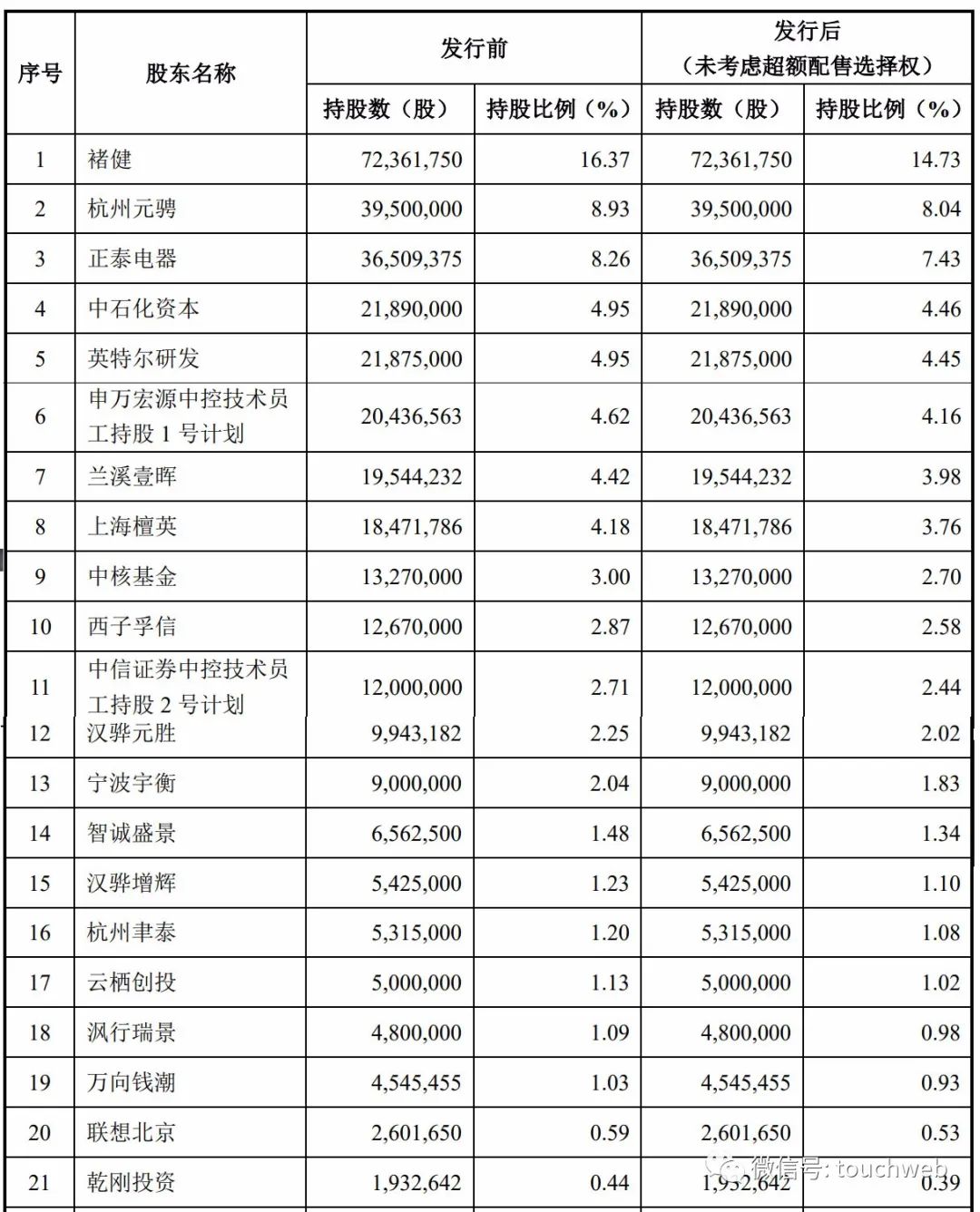 IPO后,杭州元骋持股为8.04%,正泰电器持股为7.43%,中石化资本持股为4.46%,英特尔研发持股4.45%;