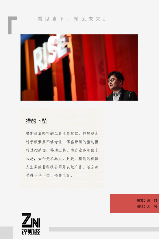 对于一家依靠轻巧的工具业务起家的公司来说,猎豹的转型的确太过于频繁且不够专注,傅盛带领的猎豹辗转过PC杀毒、移动工具、内容业务等数个战场,如今是机器人。