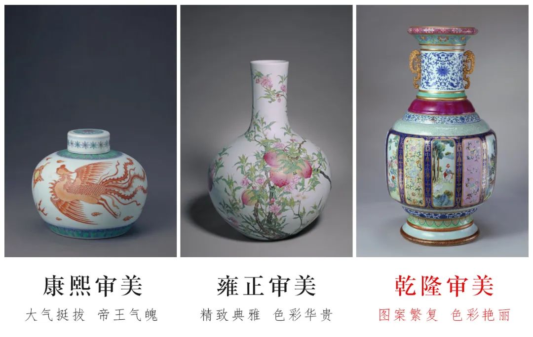 不同于父亲和爷爷的“神仙审美”,乾隆略有些跑偏的审美一直以繁复、任性、艳丽著称,甚至因元素繁多,色彩太过浓烈而被网友戏称“人间富贵花”。独树一帜的风格总能让我们轻松从一堆瓷器中分辩出哪个是乾隆年制。