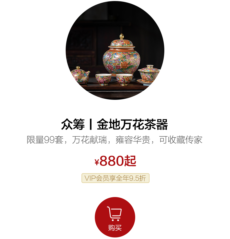 支持4980元,可获得手作万花献瑞描金茶叶罐一只,价值12980元。5、珐琅彩万花献瑞描金茶器套组