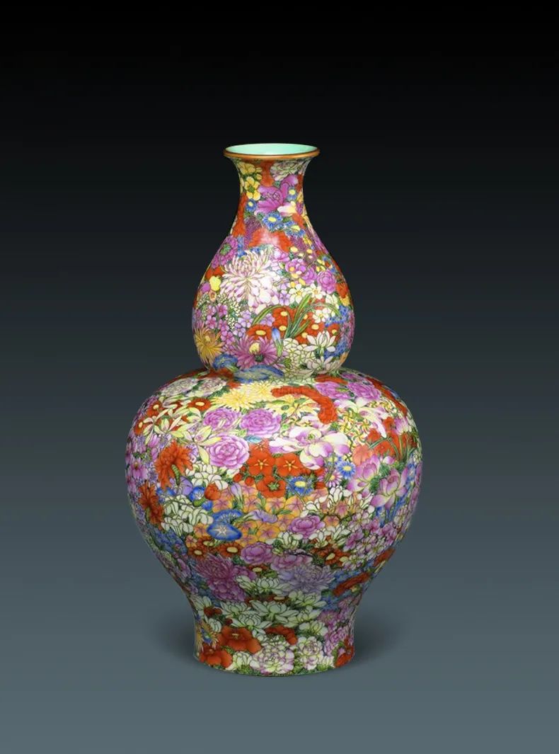 | 万花不露地葫芦瓶 中国国家博物馆馆藏各大博物院亦有收藏,例如,中国国家博物馆就收藏了一只乾隆年“万花不露地葫芦瓶”,瓶身花卉繁密,满布器身,一览风华。