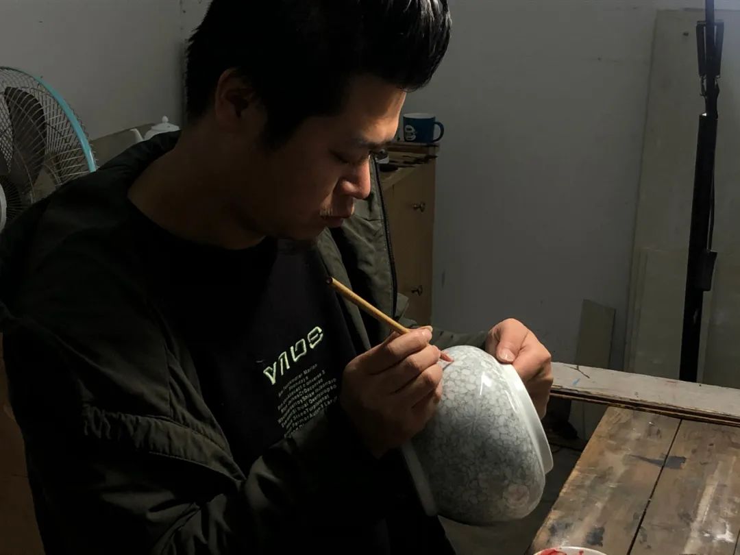 | 描线在圆滚滚的白瓷胎上作画,可和纸面不同,每一笔都要考虑结构和走向,一笔有误,全域皆变,非常考验临摹画稿的基础,一旦有误,便要重头来过,画成,过火二烧。