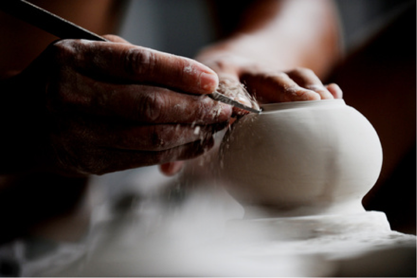| 手工拉坯、利坯想修整出光洁饱满的器物,非经验老到的匠人不行,首先要能熟练掌握泥料的特点,制作时保证每一个部分泥料的厚度、大小相同,误差控制在3mm以内。这样不仅器型连贯,也更方便掌控烧制的温度,减少爆裂的风险。
