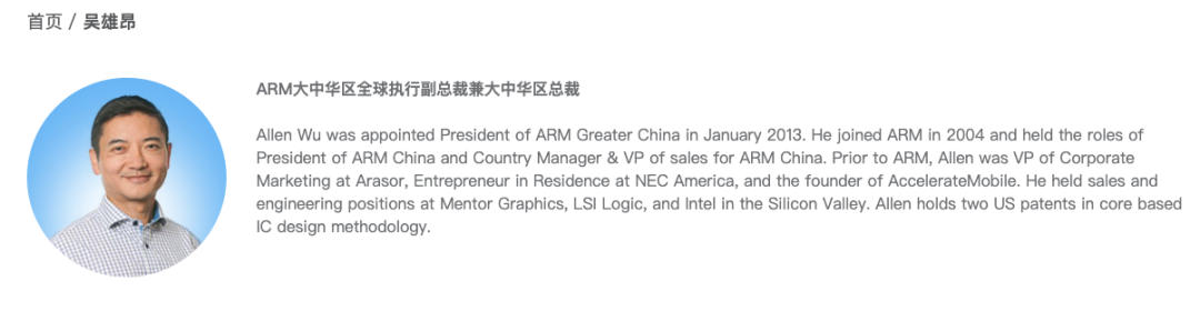 加入ARM之前,吴雄昂还曾经创立了美国硅谷 AccelerateMobile 公司,并曾在Mentor Graphics、LSI Logic、Intel担任过管理、市场、销售与工程等职务。