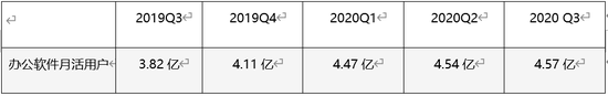2020年第三季度,金山软件来自办公软件及服务以及其他的收益为6.09亿元, 同比增长59%,环比增长11%。金山办公软件(包含WPS Office和金山词霸)的月活跃用户数量在第三季度出现1%的环比增长,达到4.57亿,同比则增长20%;其中WPS Office PC 版月度活跃用户数1.76亿,同比增长23.08%,移动版月度活跃用户数2.74亿,同比增长19.13%;金山词霸的月度活跃用户数已近千万级别。
