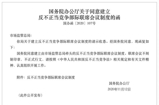这是我国政府首次设立反不正当竞争部际联席会议制度,也是继11月10日,国家市场监管总局发布《关于平台经济领域的反垄断指南(征求意见稿)》,要加大对互联网巨头涉嫌垄断的调查和监管后,政府层面给出的重磅回复。