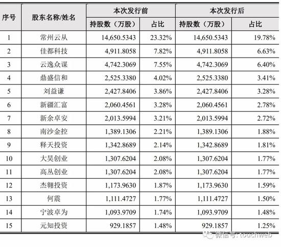 IPO后,常州云从持股为19.78%,佳都科技持股为6.63%,云逸众谋持股为6.40%,鼎盛信和持股为3.41%,刘益谦持股为3.28%;