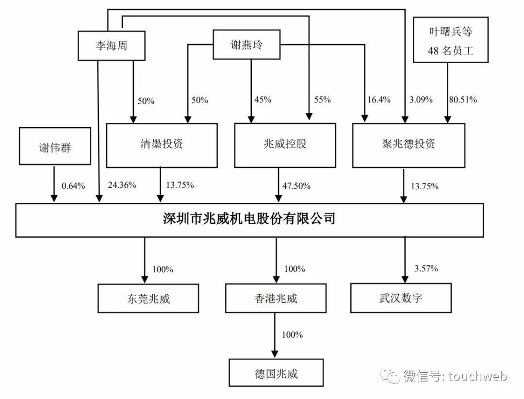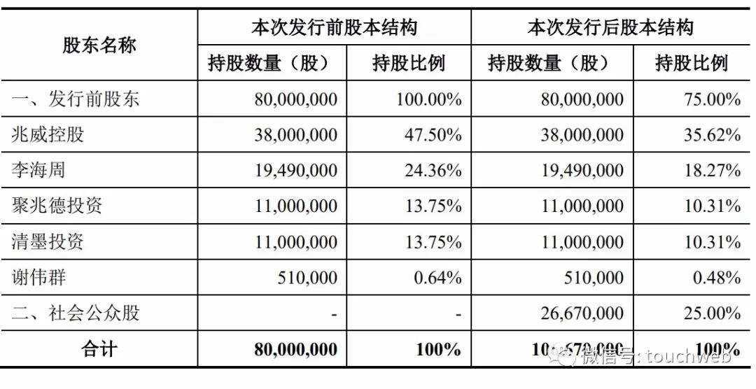 IPO后,兆威控股持股为35.62%,李海周直接持股为18.27%,聚兆德投资持股为10.31%,清墨投资持股为10.31%,谢伟群持股为0.48%。