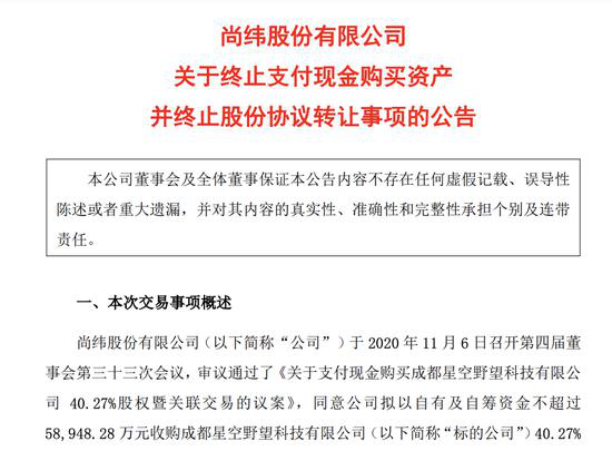 12月3日晚间,尚纬股份(603333.SH)发布公告,终止购买成都星空野望科技有限公司(简称“星空野望”)40.27%股权。