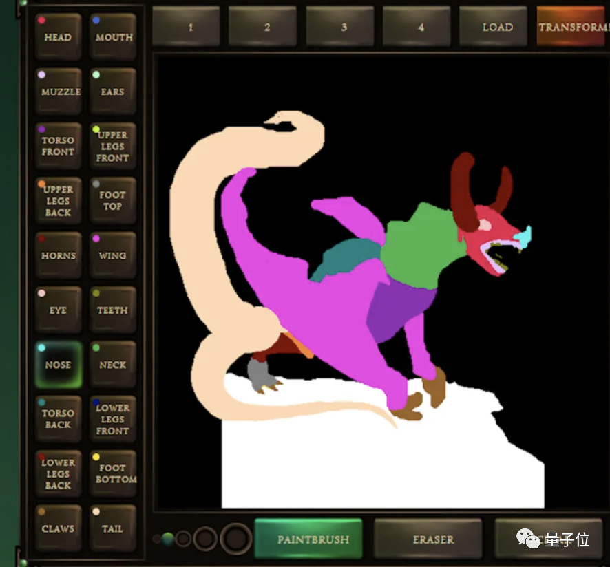 再将「分割图」的单色(例如头,耳,颈等部分)套用到模型上,确保GAN了解到艺术家指定的的结构,形状,纹理和比例。