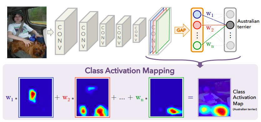 类激活地图(CAM)是一种通过对中间层的特征图进行线性加权来定位图像中判别性的位置。2015年提出的CAM ,首先对最后一层卷积结果进行全局池化得到一维的向量,向量再输入其后的全连接层分类得到最终预测结果。