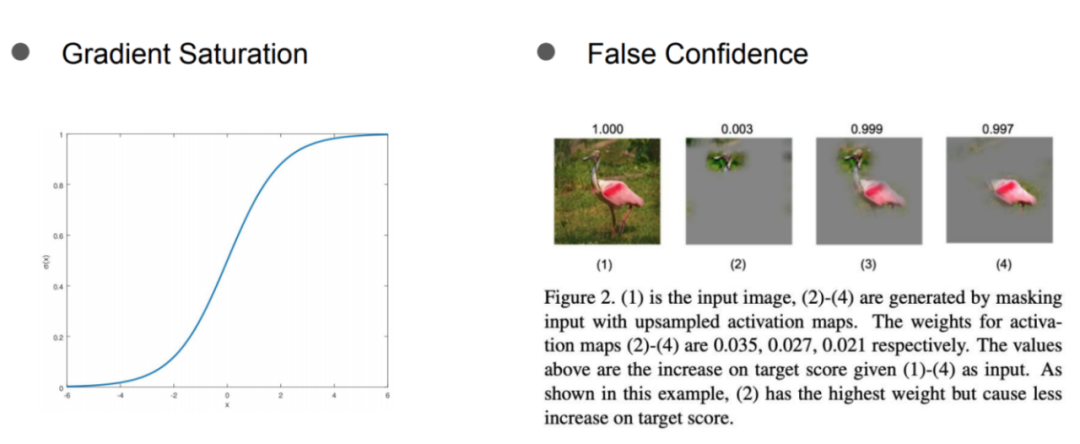 作者分析基于梯度的CAM中问题,可能来源于梯度本身,即梯度的饱和性(类似于Sigmoid函数,当特征强度超过一定程度,其梯度可能会变小),以及梯度本身的不稳定性(局部的梯度受噪声影响很大),甚至是梯度消失的影响。