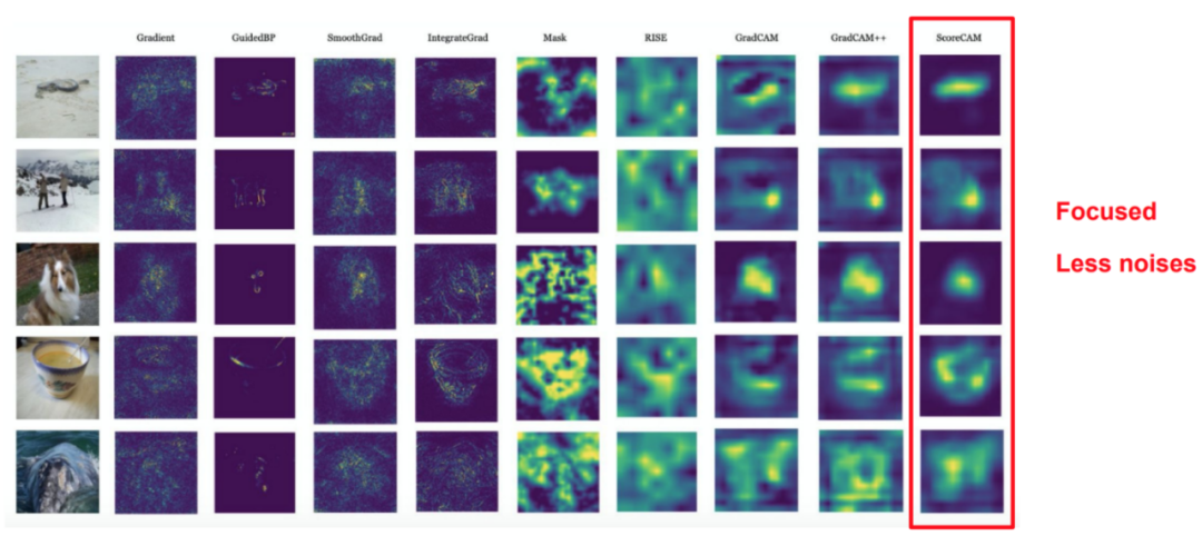 可以看到Score-CAM相较于此前的方法,可视化的结果明显更为聚焦,背景中的噪声减少。