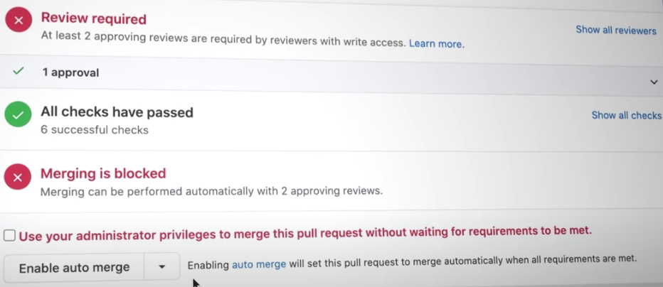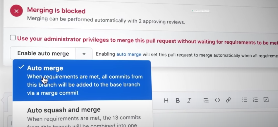而 Auto-merge(自动合并)解决了这个问题,它允许拉请求的作者选择在所需的审查或状态检查通过后自动合并拉请求。这意味着合并会发生得更快,一旦提交了请求,就可以进入下一个任务。
