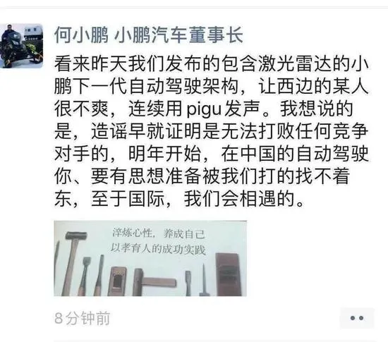 在马斯克眼中,小鹏有特斯拉旧版本的软件,但没有其神经网络(neuralnetwork, NN)计算机,所以下一代车不得以采用激光雷达技术。何小鹏则在朋友圈爆粗,扬言要把特斯拉打的找不到东。