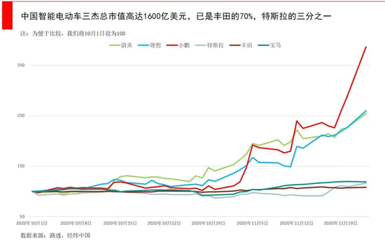 综合来看,2020年蔚来的股价年内涨了 1125%、理想涨了231%,小鹏259%,加起来,这三家公司年内市值一共上涨了1030亿美元。