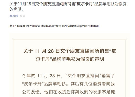 从最新情况来看,王海似乎已占据了更多上风。12月15日,罗永浩通过个人微博转发、公众号等渠道发布声明,承认其11月28日在“交个朋友直播间”销售的“皮尔卡丹”品牌羊毛衫,部分送检后鉴定为非羊毛制品。