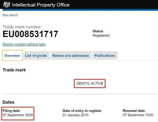 对于商标,英国知识产权局官网显示,“DENTYL ACTIVE”商标早在2009年12月就被提交申请,2010年1月注册,商标所有人是Venture Life Group Plc。
